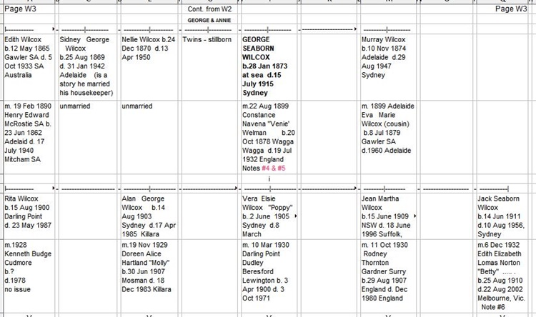 Correction - Edith Wilcox b.1866 not 1865 Notes: 4- George born on "City of Adelaide". 5- George died at "Okinya". Venie died in England and her remains were brought back to Australia.