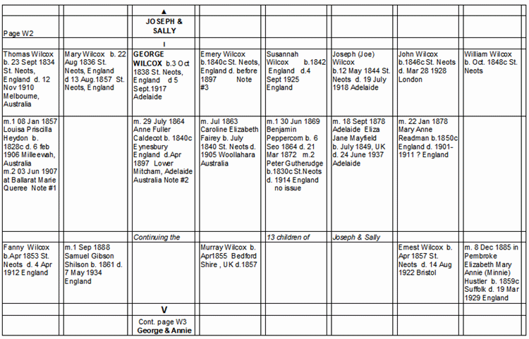 The family trees below are revisions to the original trees by Judy Andrews. (The earliest known ancestor was Thomas not Joseph Wilcocks as claimed by Sidney Wilcox in his account to Alan Wilcox. The father of Thomas, Joseph, Mary & William Wilcox was a Thomas Wilcox b. 1777, d. 1817)